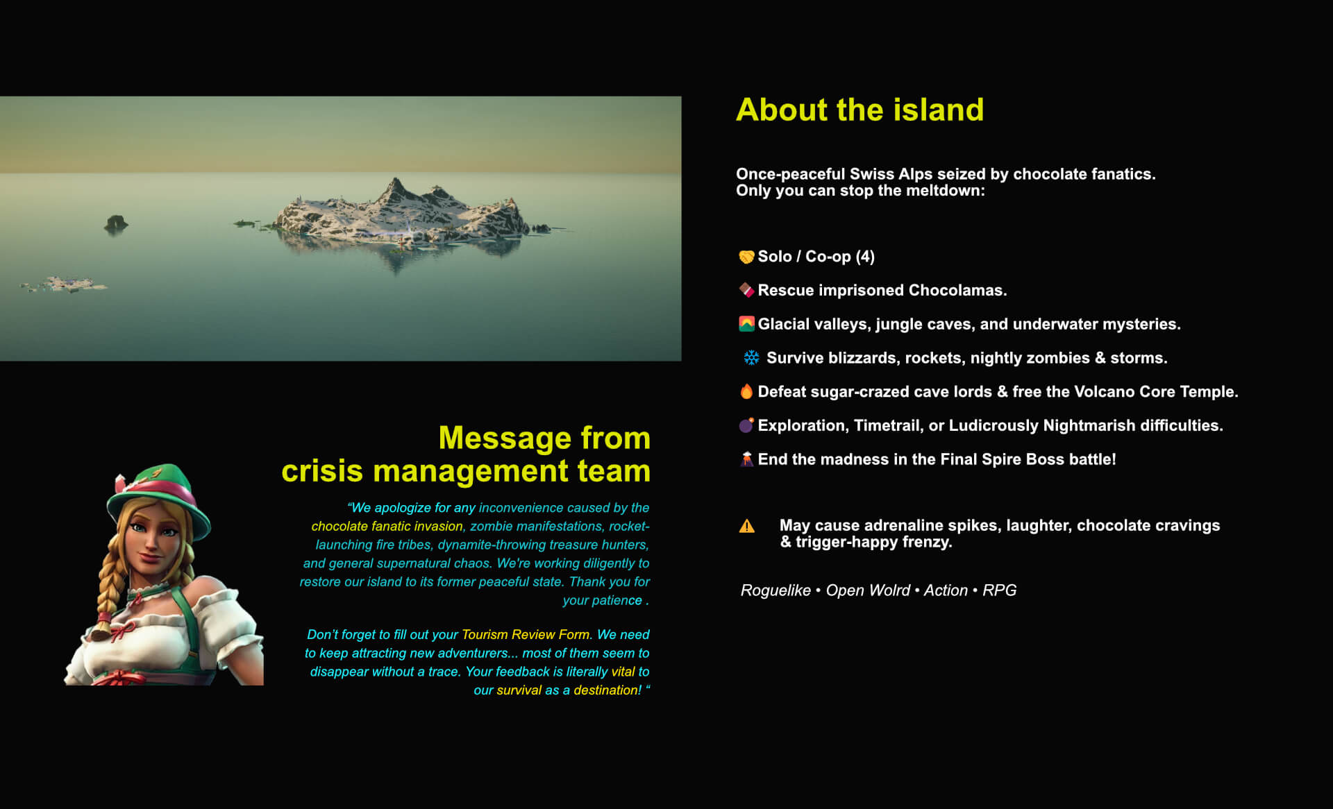 a Message from the crisis management Team by Head of Spin | Current island status (0:52) https://verticalgames.ch/wp-content/uploads/2025/11/MessageFromtheCrisisManagementteam.mp3 Welcome to the mountain by Retro Futurist Announcer | Island Description (1:41) https://verticalgames.ch/wp-content/uploads/2025/11/RadioSpot1.mp3 Gear up and explore by Island Survivor | Equipment Strategy (0:26) https://verticalgames.ch/wp-content/uploads/2025/11/moiblitiy.mp3 Cultural education program by Island Explorer | Real world connection (0:24) https://verticalgames.ch/wp-content/uploads/2025/11/WelcomeTotheIsland.mp3 Back Back Follow Download Pdf Presentation Back